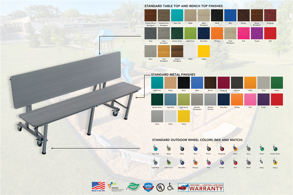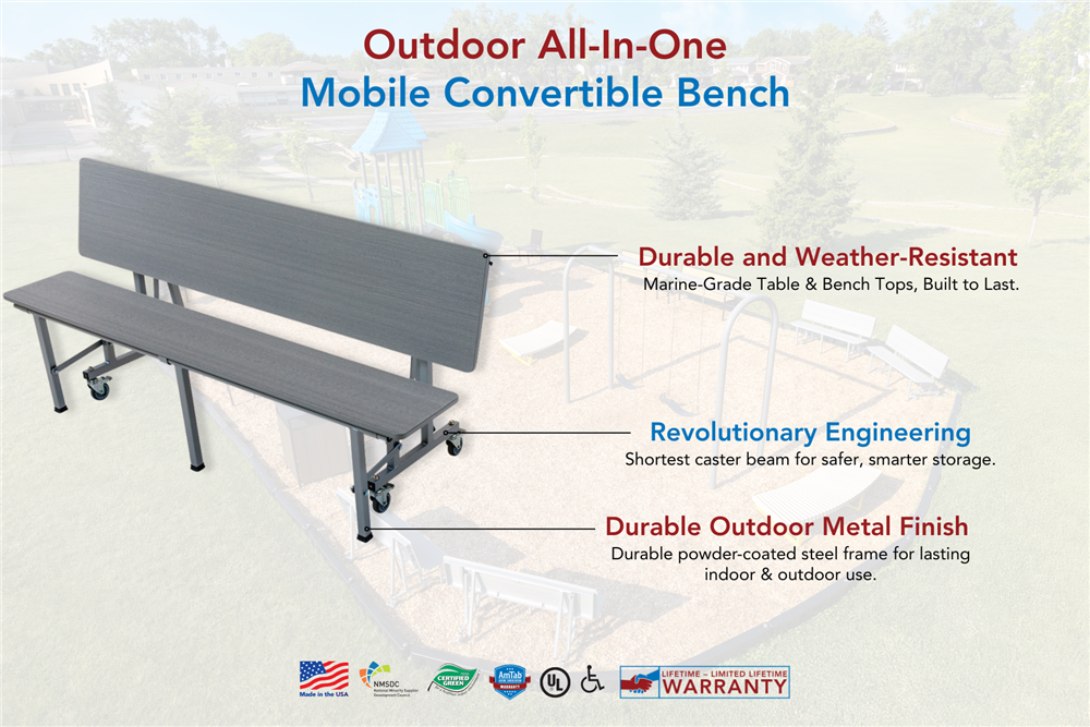 That’s why AmTab® designed the Outdoor All-In-One Mobile Convertible Bench. With a versatile design that seamlessly transforms from bench to table, it’s built to adapt to any setting. Whether students are gathering for lunch, group work, or community events, this solution makes configuration simple, fast, and reliable.